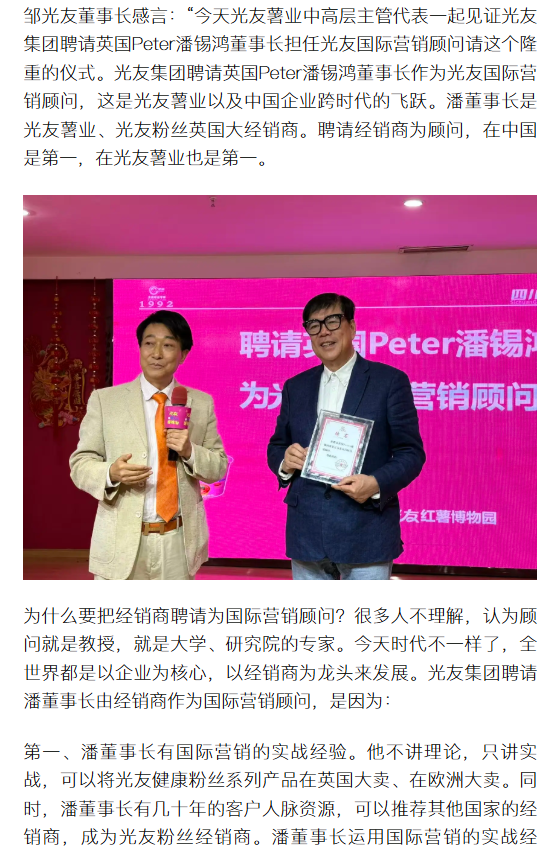 轉(zhuǎn)載搜狐網(wǎng)-光友薯業(yè)攜手國際營銷顧問 讓中國健康粉絲登陸全球超市