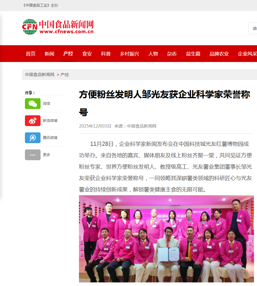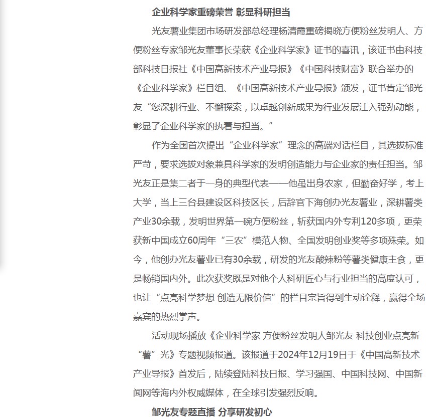 方便粉絲發(fā)明人鄒光友獲企業(yè)科學(xué)家榮譽(yù)稱號