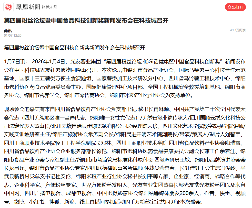 轉(zhuǎn)載鳳凰網(wǎng) 第四屆粉絲論壇暨中國食品科技創(chuàng)新獎新聞發(fā)布會在科技城召開